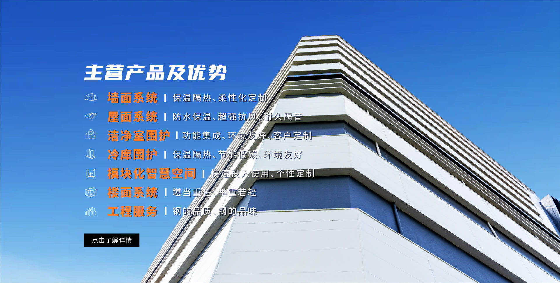 墻面系統(tǒng) 屋面系統(tǒng) 樓面系統(tǒng) 建筑鋼結(jié)構 潔凈室圍護 冷庫圍護 得默產(chǎn)品系列 全面解決方案